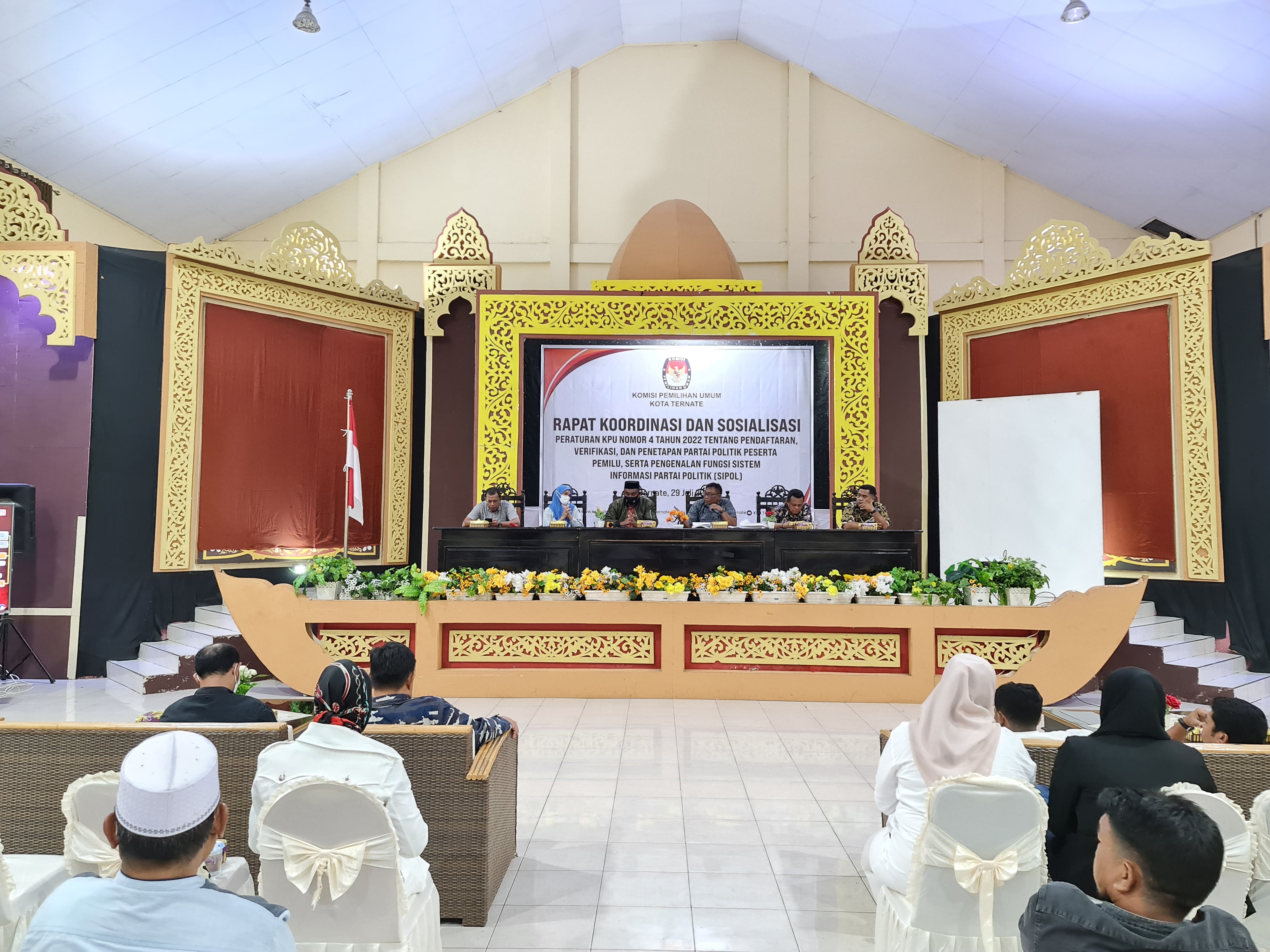 KPU Kota Ternate melaksanakan Rapat Koordinasi dan Sosialisasi Peraturan KPU Nomor 4 Tahun 2022 Tentang Pendaftaran, Verifikasi, dan Penetapan Partai Politik Peserta Pemilu, serta Pengenalan Fungsi Sistem Informasi Partai Politik (SIPOL), Jumat (29/7).