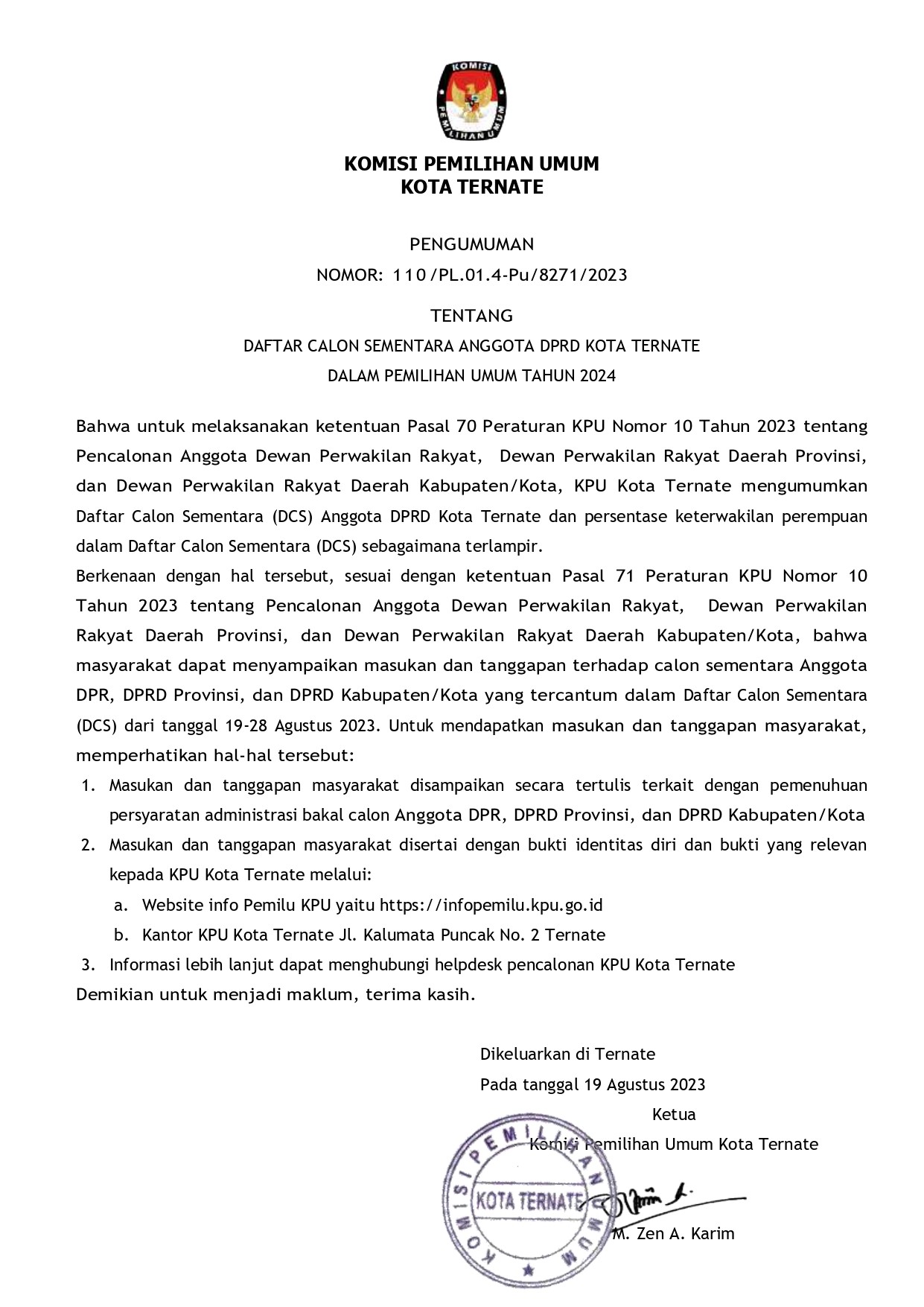 PENGUMUMAN DCS ANGGOTA DPRD KOTA TERNATE DALAM PEMILIHAN UMUM TAHUN 2024