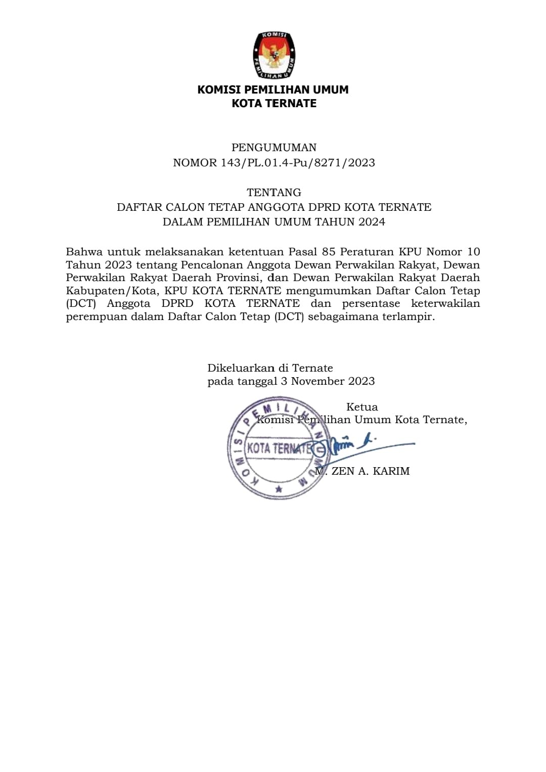 PENGUMUMAN DCT ANGGOTA DPRD KOTA TERNATE DALAM PEMILIHAN UMUM TAHUN 2024
