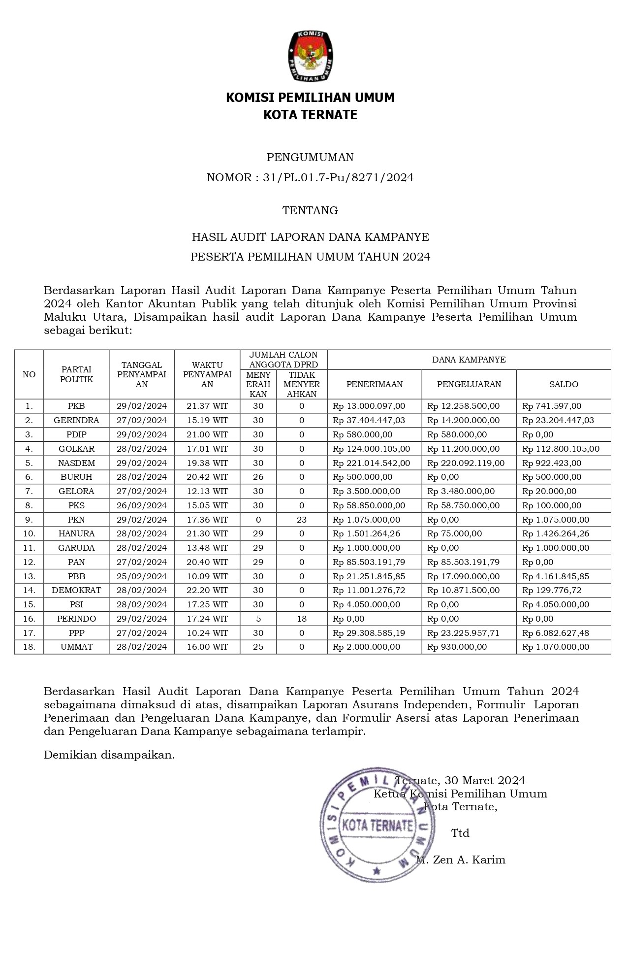 PENGUMUMAN HASIL AUDIT LAPORAN DANA KAMPANYE PESERTA PEMILIHAN UMUM TAHUN 2024 Minggu, 31 Maret 2024 20:24 1408 DOWNLOAD PENGUMUMAN Bagikan: Dilihat 1,408 Kali.