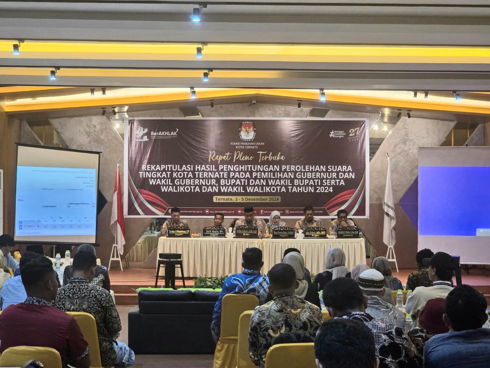 #TemanPemilih KPU Kota Ternate telah melaksanakan Rapat Pleno Terbuka Rekapitulasi Hasil Penghitungan Perolehan Suara tingkat Kota Ternate pada Pemilihan Gubernur dan Wakil Gubernur, Bupati dan Wakil Bupati serta Walikota dan Wakil Walikota tahun 2024, bertempat di Meeting Room Waterboom, Selasa 3 Desember 2024.