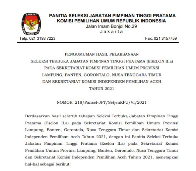 Jakarta, kpu.go.id - Pengumuman Hasil Pelaksanaan Seleksi Terbuka Jabatan Pimpinan Tinggi Pratama (Eselon II.a) pada Sekretariat KPU Provinsi Lampung, Banten, Gorontalo, NTT dan KIP Aceh Tahun 2021, Nomor 218/Pansel-JPT/SetjenKPU/VI/2021.