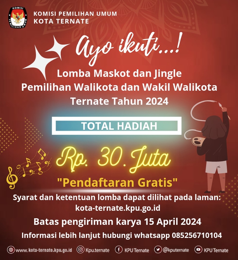 PENGUMUMAN LOMBA MASKOT DAN JINGLE PILKADA 2024 Jumat, 05 April 2024 20:24 1696 DOWNLOAD PENGUMUMAN Bagikan: Dilihat 1,696 Kali.