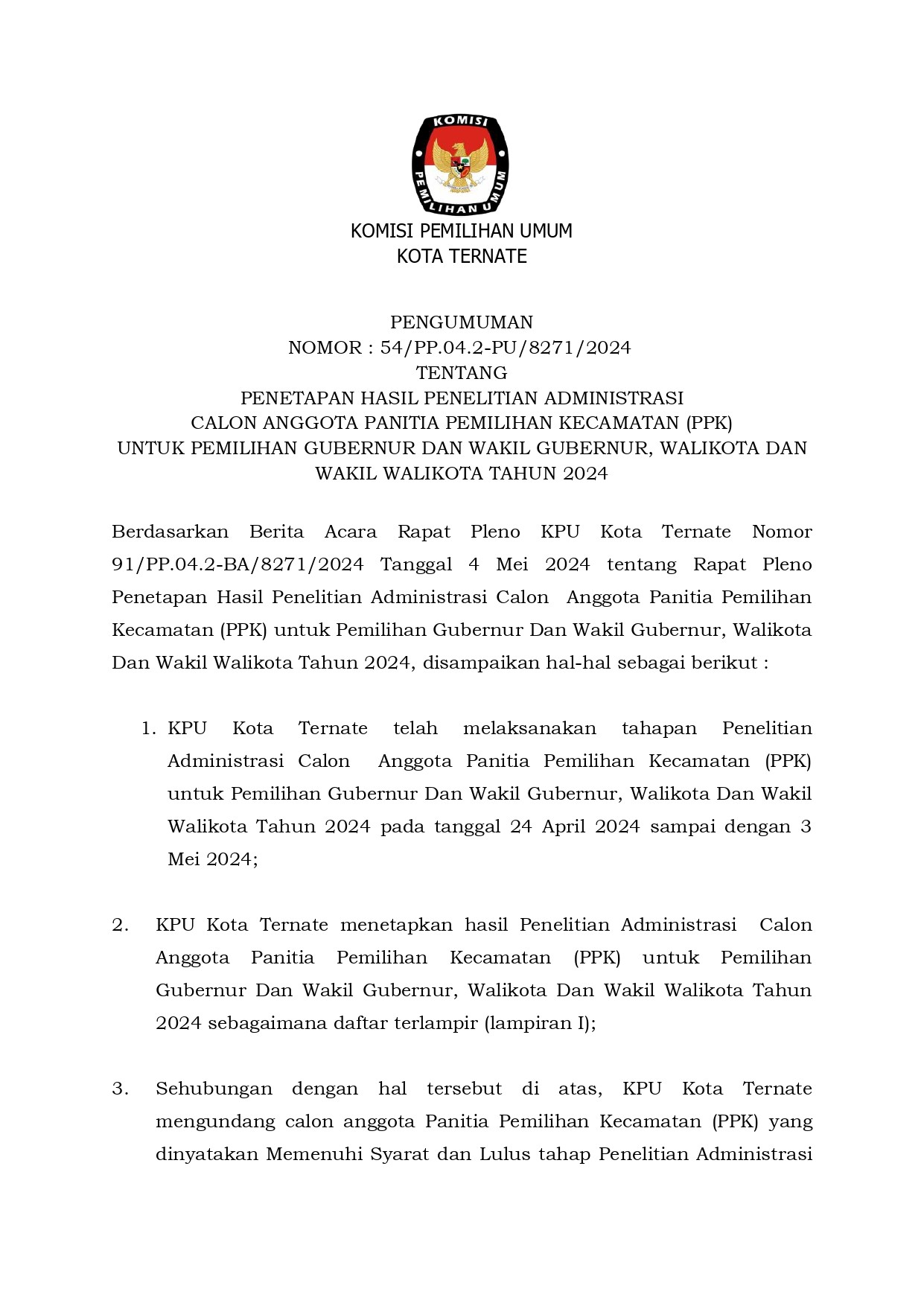 PENGUMUMAN PENETAPAN HASIL PENELITIAN ADMINISTRASI PPK PILKADA TAHUN 2024 Minggu, 05 Mei 2024 20:24 1417 DOWNLOAD PENGUMUMAN Bagikan: Dilihat 1,417 Kali.