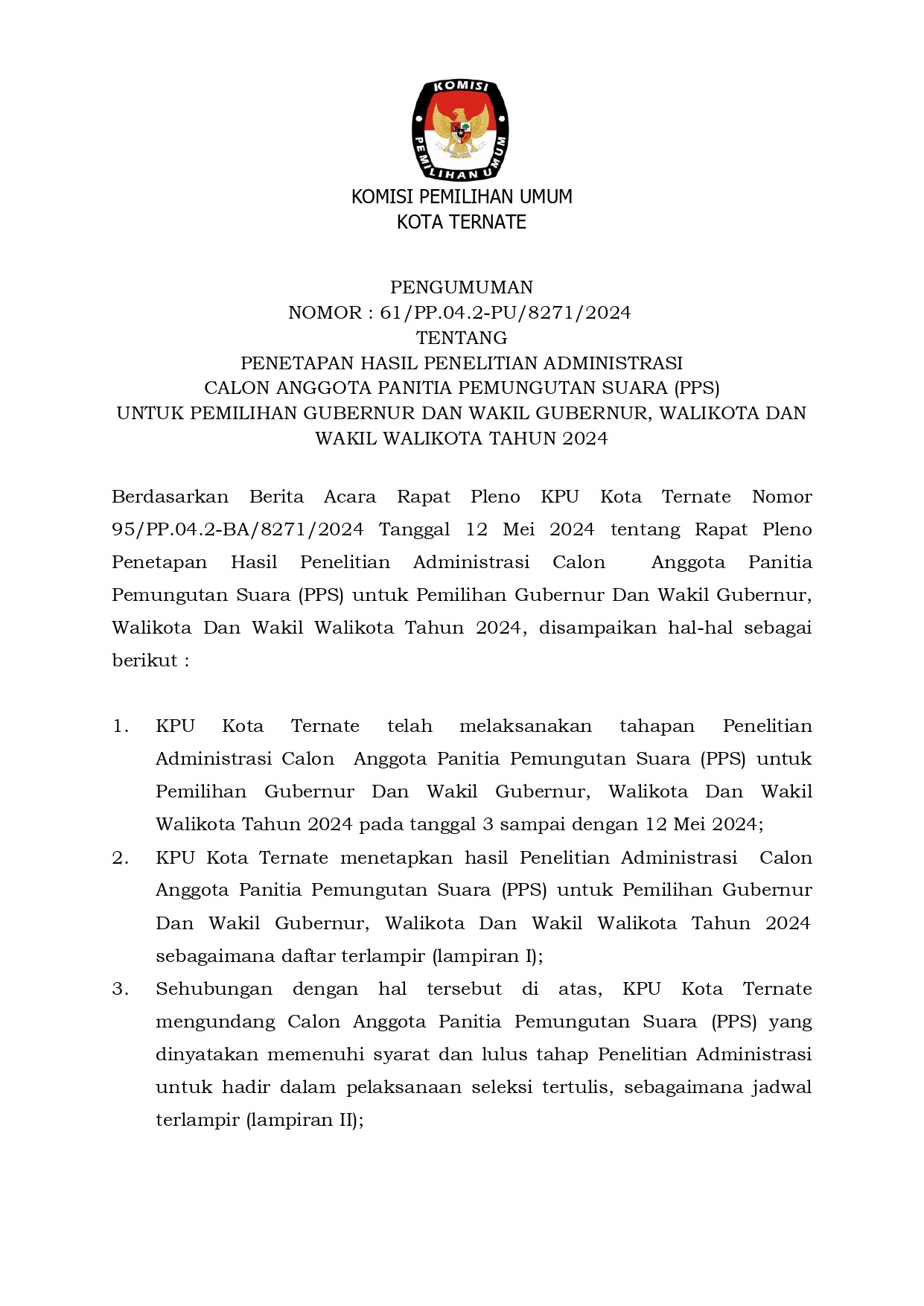 PENGUMUMAN PENETAPAN HASIL PENELITIAN ADMINISTRASI PPS PILKADA TAHUN 2024 Rabu, 15 Mei 2024 20:24 1283 DOWNLOAD PENGUMUMAN Bagikan: Dilihat 1,283 Kali.