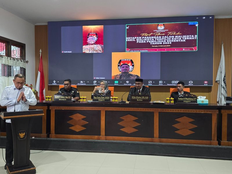 Rapat pleno berdasarkan Peraturan Komisi Pemilihan Umum Nomor 2 Tahun 2024 tentang Tahapan dan Jadwal Pemilihan Gubernur dan Wakil Gubernur, Bupati dan Wakil Bupati, serta Walikota dan Wakil Walikota Tahun 2024 dan putusan Mahkamah Konstitusi Nomor Perkara 42/PHPU.WAKO-XXIII/2025 tanggal 4 Februari 2025, menetapkan Pasangan Calon Walikota dan Wakil Walikota Kota Ternate Nomor Urut 2 (dua) Sdr. Dr. Mohammad Tauhid Soleman, M.Si. dan Sdr. Nasri Abubakar dengan perolehan suara sebanyak 45.658 (empat puluh lima ribu enam ratus lima puluh delapan) suara atau 47,91% (empat puluh tujuh koma sembilan puluh satu persen) dari total suara sah, sebagai Pasangan Calon Walikota dan Wakil Walikota Terpilih Kota Ternate Periode Tahun 2025-2030 dalam Pemilihan Calon Walikota dan Wakil Walikota Kota Ternate Tahun 2024.