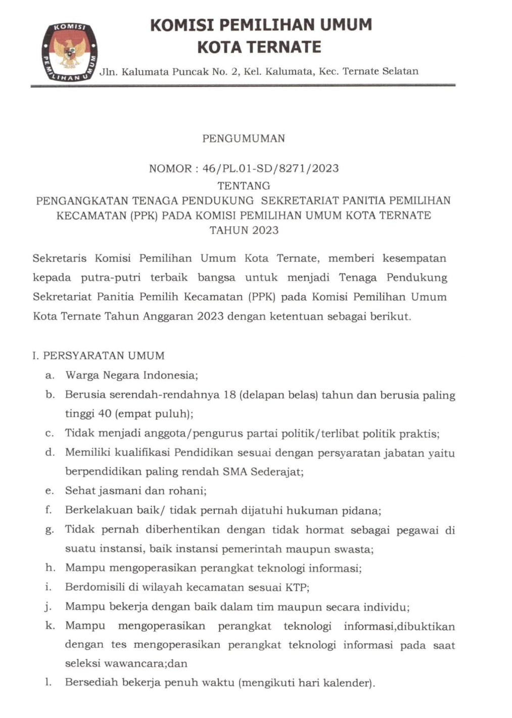 Pengumuman Pengangkatan Tenaga Pendukung Sekretariat PPK Kecamatan Se-Kota Ternate dapat didownload di bawah ini:
