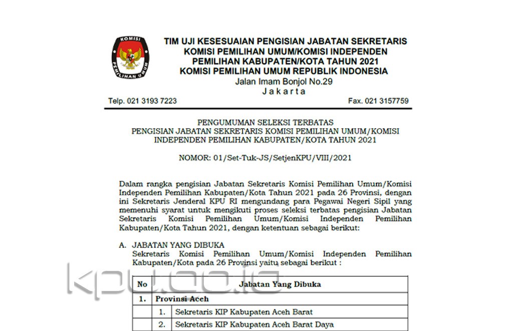 Pengumuman Seleksi Terbatas Pengisian Jabatan Sekretaris KPU/KIP Kabupaten/Kota Tahun 2021