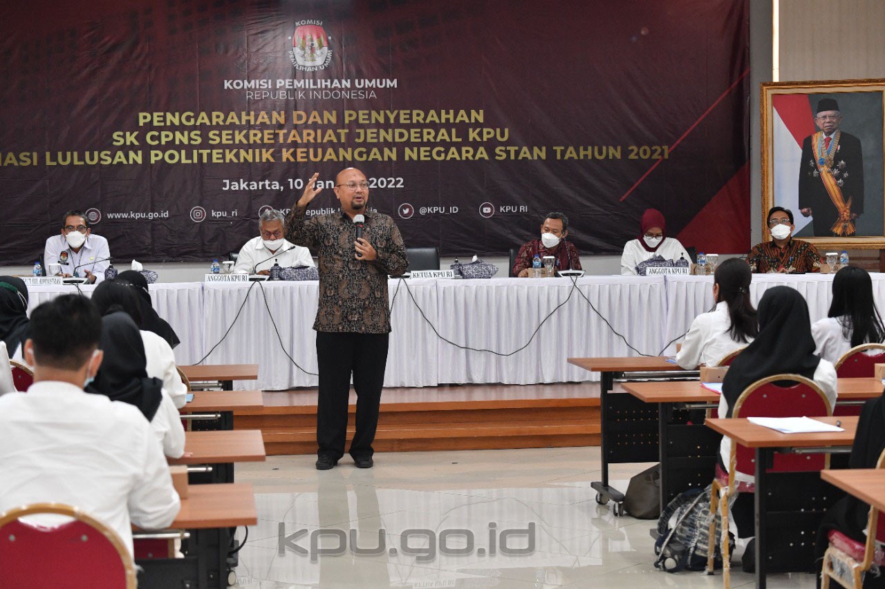 Jakarta, kpu.go.id – Komisi Pemilihan Umum (KPU) RI mendapat dukungan 55 Calon Pegawai Negeri Sipil (CPNS) Formasi Lulusan Politeknik Keuangan Negara Sekolah Tinggi Administrasi Negara (STAN) Tahun 2021. SK CPNS Sekretariat Jenderal KPU diserahkan langsung Ketua KPU RI, Ilham Saputra secara simbolis kepada dua perwakilan CPNS.