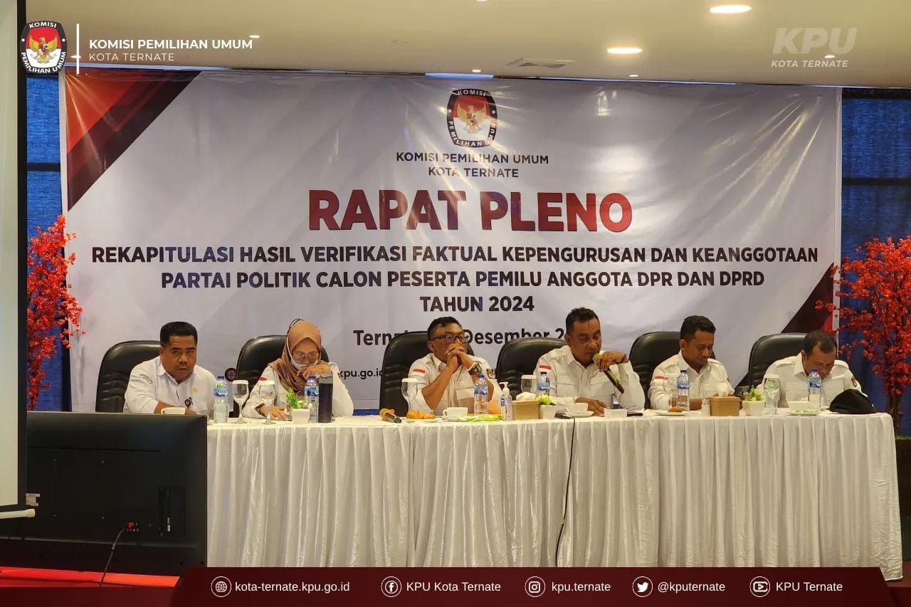 #TemanPemilih, KPU Kota Ternate melaksanakan Rapat Pleno Rekapitulasi Hasil Verifikasi Faktual Kepengurusan dan Keanggotaan Partai Politik Calon Peserta Pemilu Serentak 2024 sekaligus penyerahan Berita Acara Hasil Klarifikasi Tanggapan Masyarakat kepada Partai Politik dan Bawaslu, Kamis (8/11).