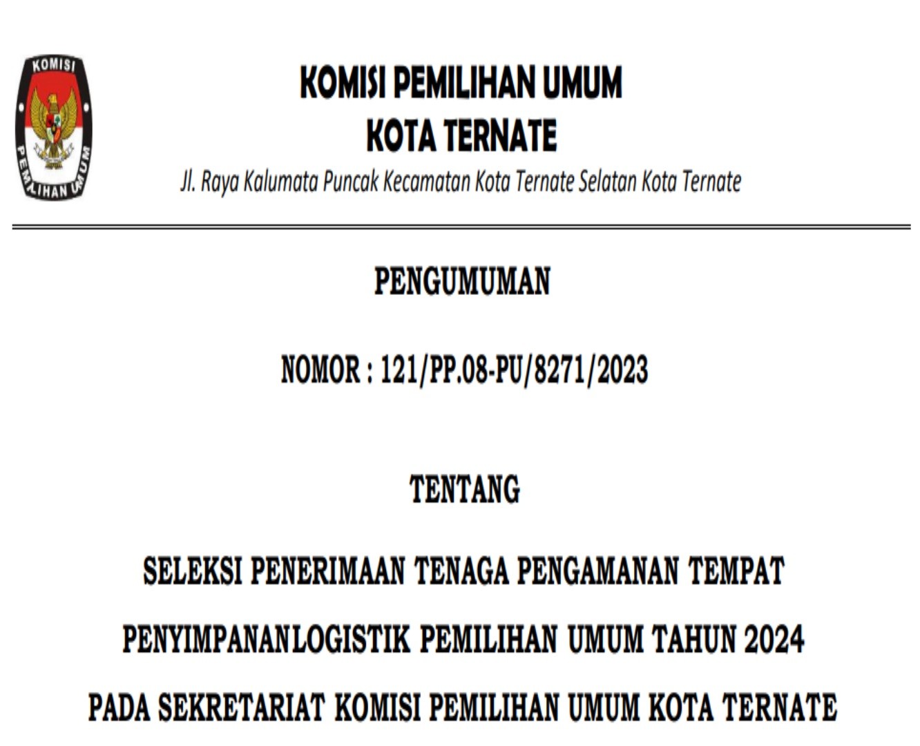 PENGUMUMAN NOMOR : 121/PP.08-PU/8271/2023 TENTANG SELEKSI PENERIMAAN TENAGA PENGAMANAN TEMPAT PENYIMPANANLOGISTIK PEMILIHAN UMUM TAHUN 2024 PADA SEKRETARIAT KOMISI PEMILIHAN UMUM KOTA TERNATE. Berdasarkan Keputusan Sekretaris Jenderal KPU RI Nomor 1960 Tahun 2023 Tentang Petunjuk Teknis Pengangkatan Tenaga Administrasi Pejabat Pembuat Komitmen dan Tenaga Pengamanan Tempat Penyimpanan Logistik Pemilihan Umum Tahun 2024 Pada Sekretariat Komisi Pemilihan Umum Provinsi dan Sekretariat Komisi Pemilihan Umum Kabupaten/Kota, Komisi Pemilihan Umum (KPU) Kota Ternate membutuhkan Tenaga Pengamanan Tempat Penyimpanan Logistik sejumlah 4 (empat) orang. Untuk itu, KPU Kota Ternate membuka kesempatan kepada Warga Negara Indonesia untuk menjadi Tenaga Pengamanan Tempat Penyimpanan Logistik melalui Seleksi Penerimaan Tenaga Pengamanan Tempat Penyimpanan Logistik Pemilu Tahun 2024 pada Sekretariat Komisi Pemilihan Umum Kota Ternate,